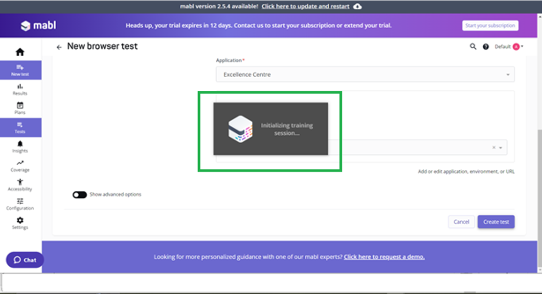 Clicking Create Test initializes the training session and launches the Mabl trainer.