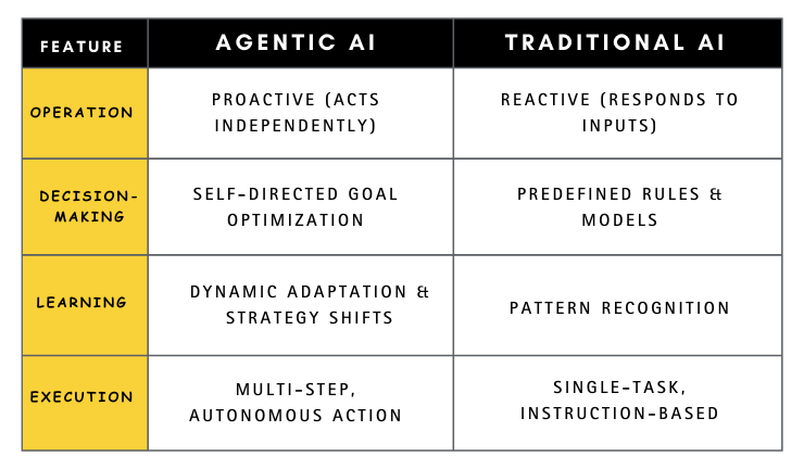 Unlike traditional AI models that passively respond to inputs (e.g., ChatGPT answering questions), agentic AI systems proactively plan, reason, and act in real-world or virtual environments. They exhibit characteristics such as self-direction, persistence, adaptability, and goal-oriented behavior.