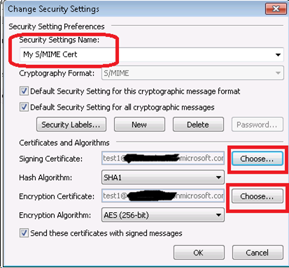 - In the Change Security Settings window, type any Security Settings Name and choose Signing and Encryption Certificate.