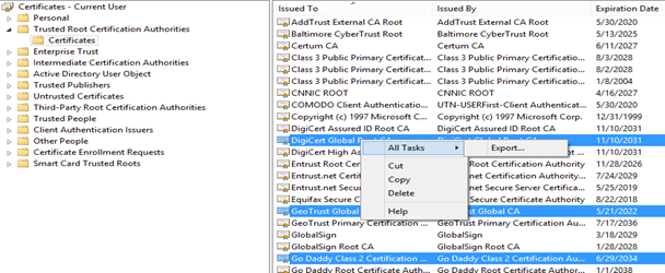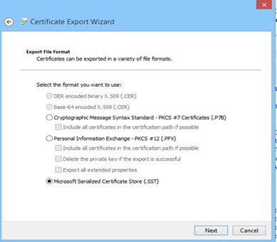 1. Create the .SST file for the Trusted Root or Intermediate CA: To export .SST file, you can either use PowerShell cmdlets or Certificate MMC. Below find the Certificate console process which is used for exporting .SST –