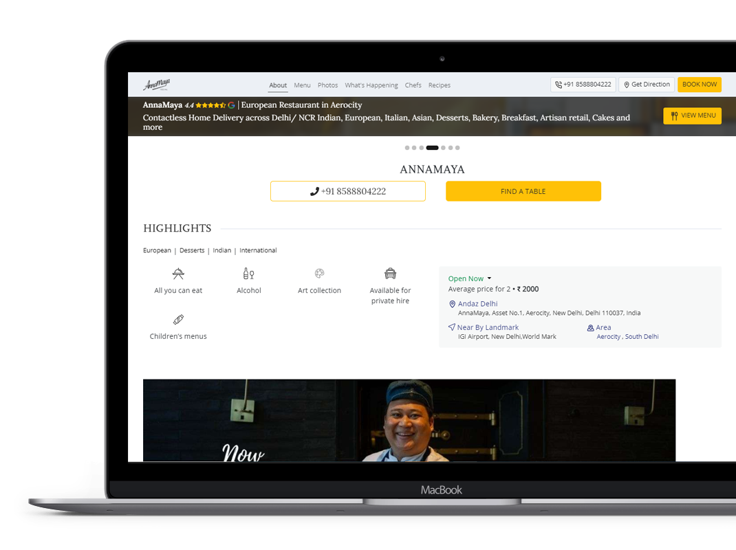 The home page enables the customers to look at the restaurant’s exclusive photos of the dining area and interiors